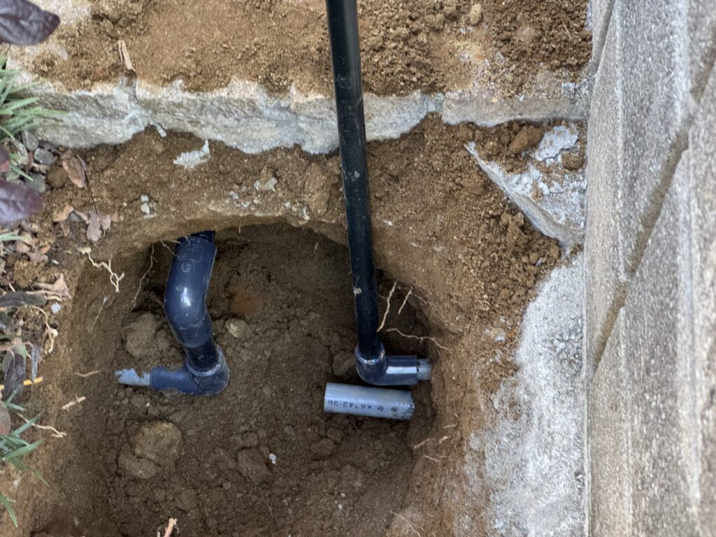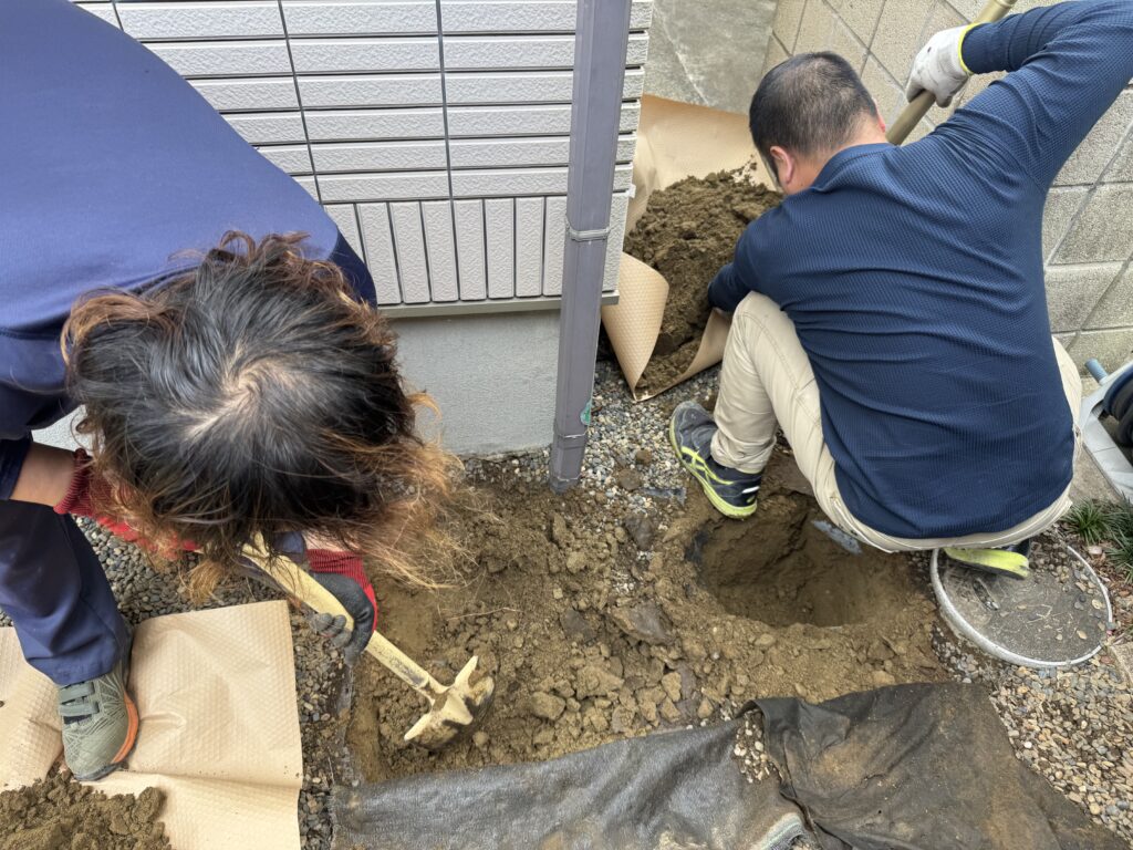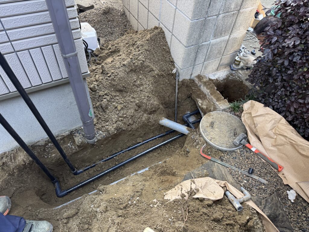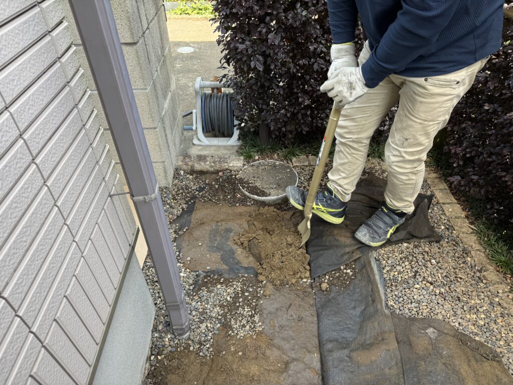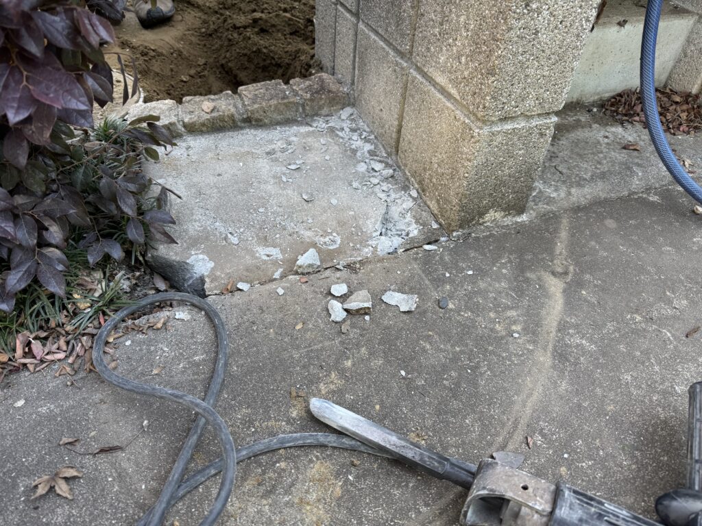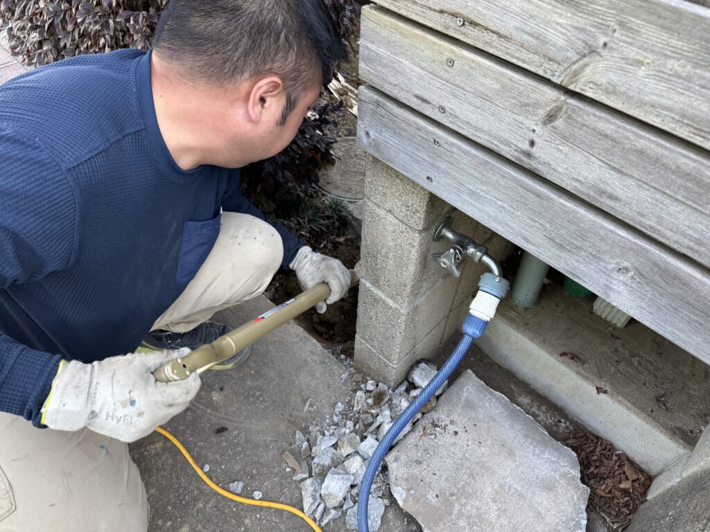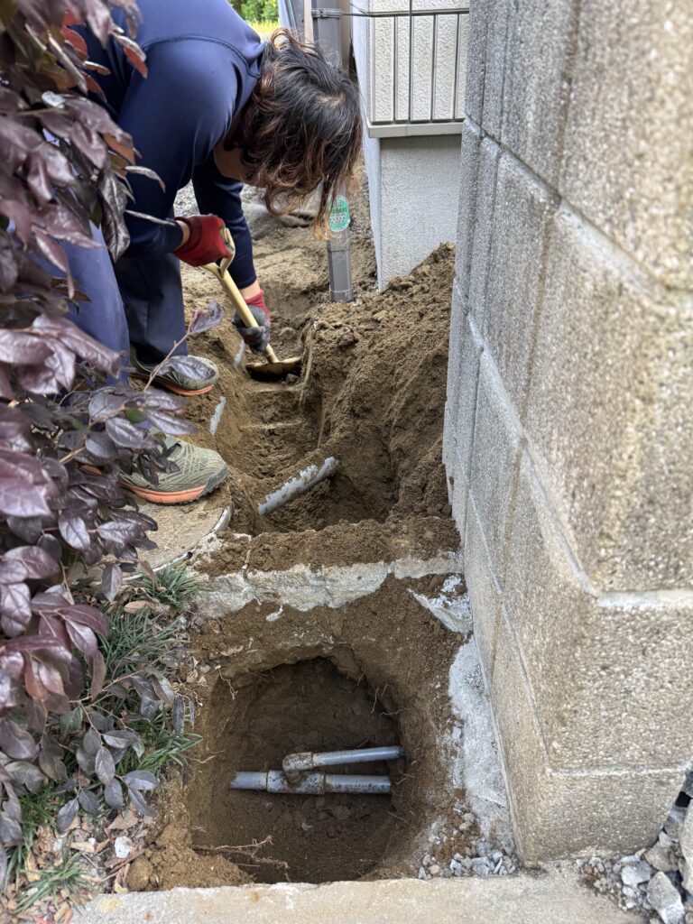 まずは土の部分掘り進め、配管を探すほうが早いですよね。