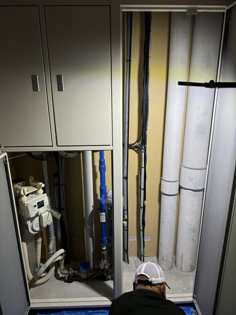 中廊下なのでちょっと暗めですが、かなり広いパイプスペースで