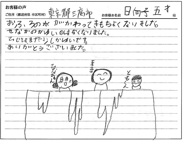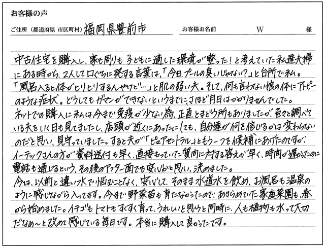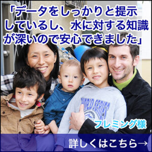 妻:それに、もともと水道水に対する危機感は、感じていましたから。 私は味とにおいに敏感なほうです。 同じ町内に引っ越したのですが、新居では、なぜか以前の家よりも、舌につくざらざら感や塩素のにおいも強く感じられました。 特に、熱いシャワーを出すと、むわっとにおいが上がります。顔を洗ったときに、目がしばしばしたり、お肌がかさかさになりました。 子供たちのことを思うと心配でした。 主人のお父様もお肌がデリケートな方で、お水が原因で湿疹が出やすいともおっしゃっていました。